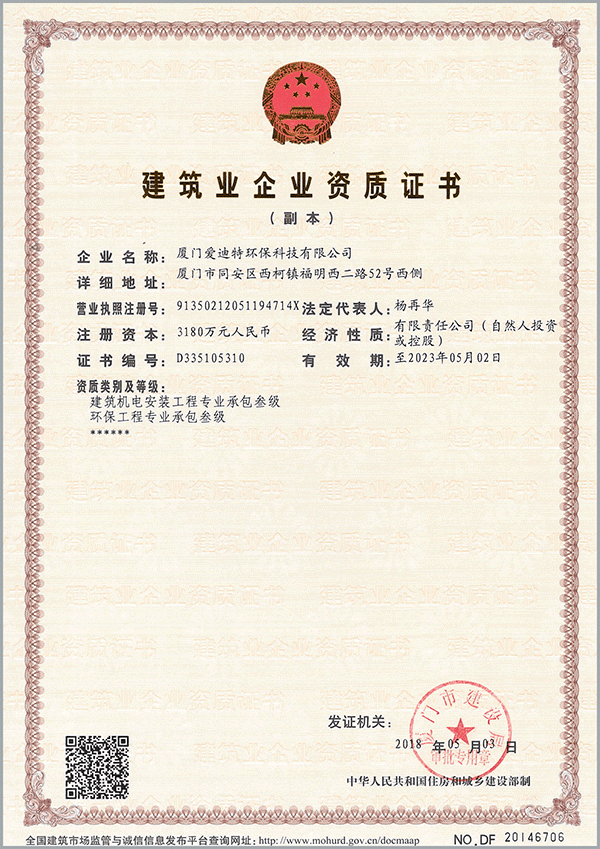 建筑機(jī)電安裝工程專業(yè)承包叁級(jí),環(huán)保工程專業(yè)承包叁級(jí)